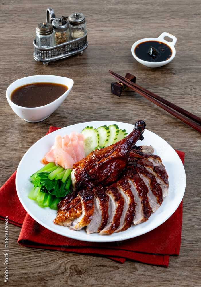 Crispy Roasted Duck served in with cucumber, Chinese kale and pickled ginger