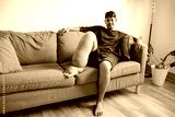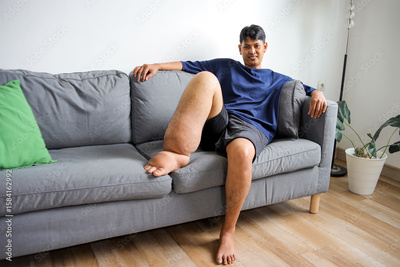 Cheerful Young Asian Man With Lymphatic Filariasis Lying On Sofa While Looking At Camera