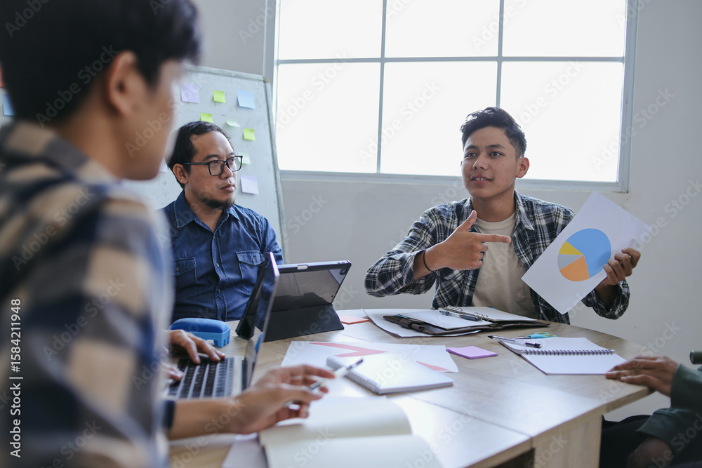 Young Asian Man Pointing To Pie Chart And Presenting Data For Analyzing Reports