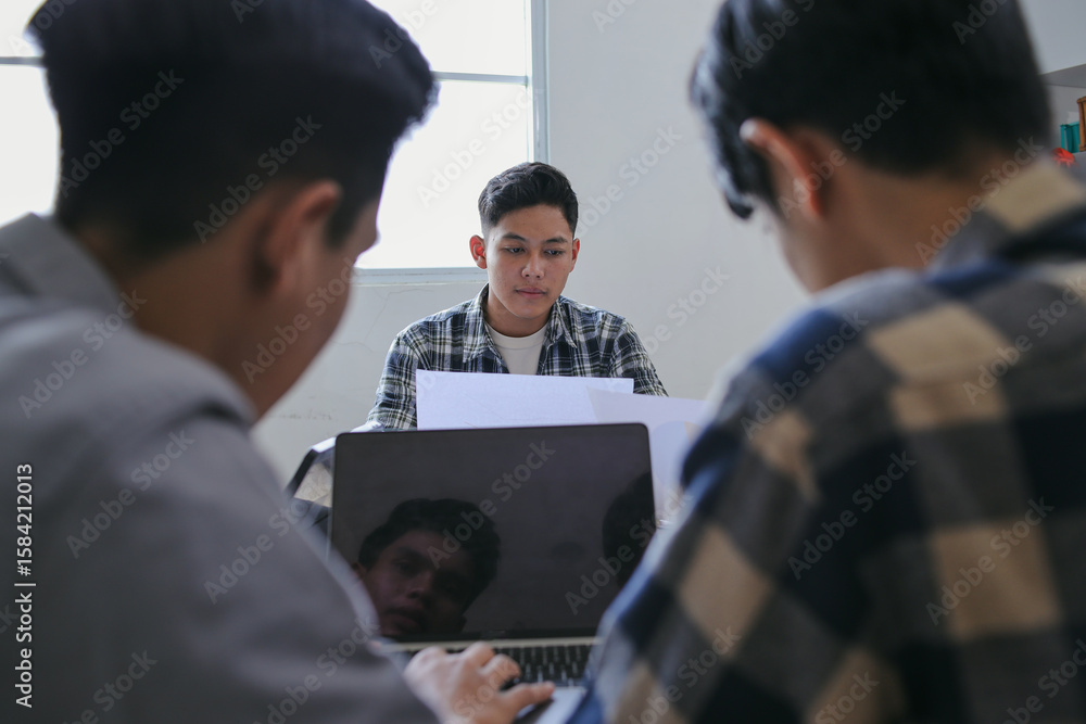 Three Young Men Intensely Focused On Work And Documents
