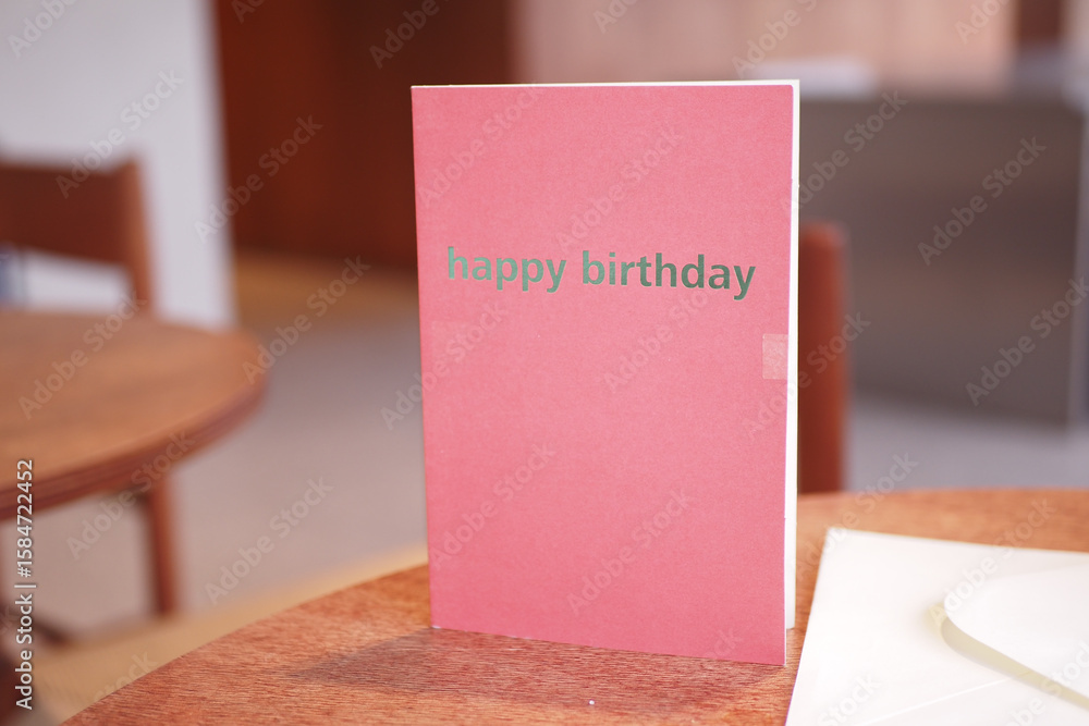 Birthday card displayed on a wooden table in a cozy setting