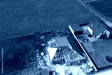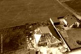 Aerial view of house frame in field