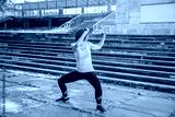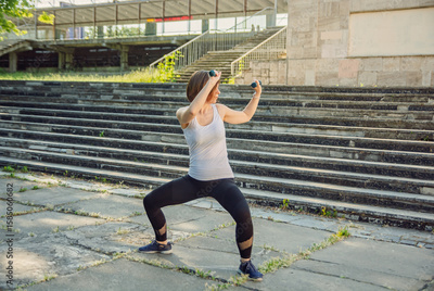 Woman exercising outdoors, holding dumbbells in a workout stance. Fitness training and active lifestyle concept with squat exercise and weights near stairs.
