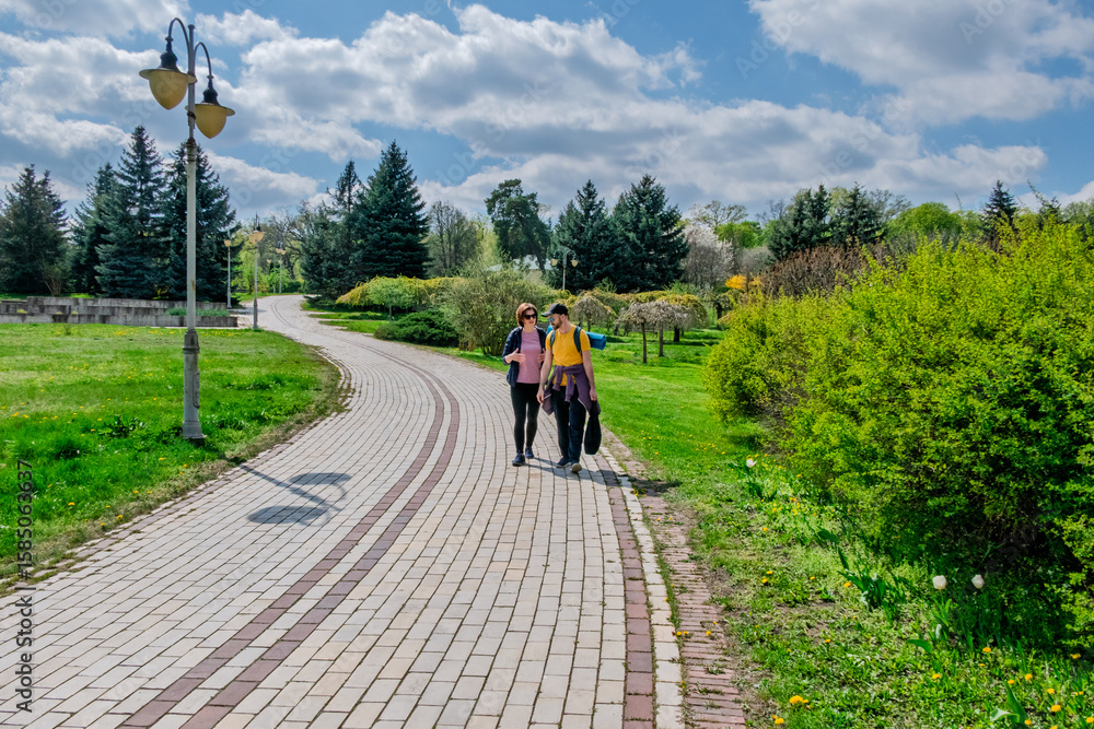 Couple walking on a paved path through a vibrant green park on a sunny spring day with trees, bushes, grass, and clouds. Leisurely stroll enjoying nature and the outdoors.
