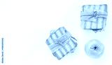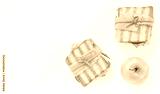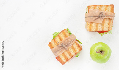Two grilled sandwiches wrapped in paper and string, served with a fresh green apple on a clean white background, ideal for a simple packed lunch