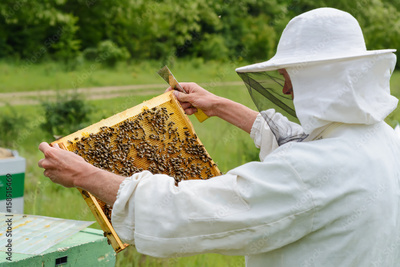The beekeeper takes out from the hive honeycomb with bees. Apiculture.