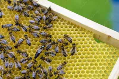 Queen bee is always surrounded by the workers - their servant. Apiculture.