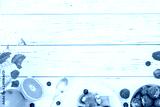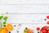 Healthy fresh fruit salad on white plate on wooden table. Top view, copy space. Delicious summer meal: strawberries, blueberries, oranges, kiwi, banana, watermelon, balm mint