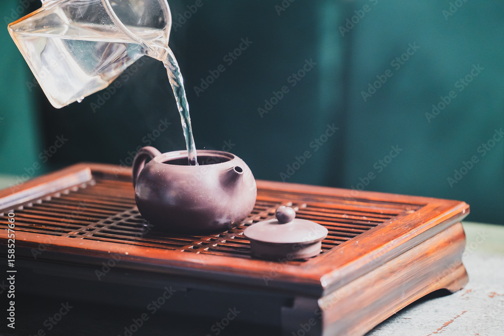 Close-up of traditional Chinese teapot on wooden tray as hot water is poured from glass pitcher, highlighting tea ceremony and brewing ritual.