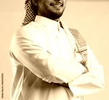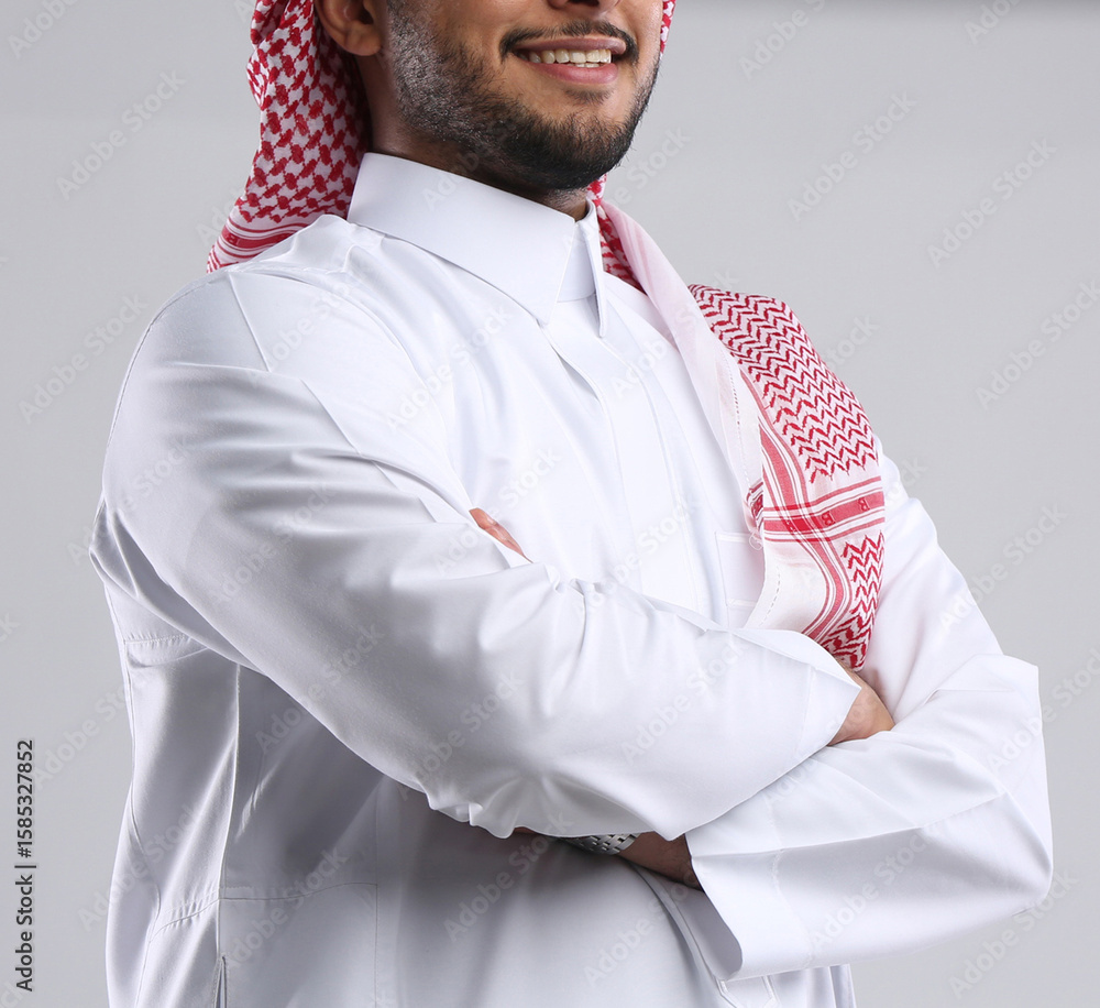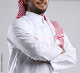 saudi arabian man in thob standing with hand folded and smiling side angel
