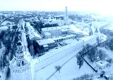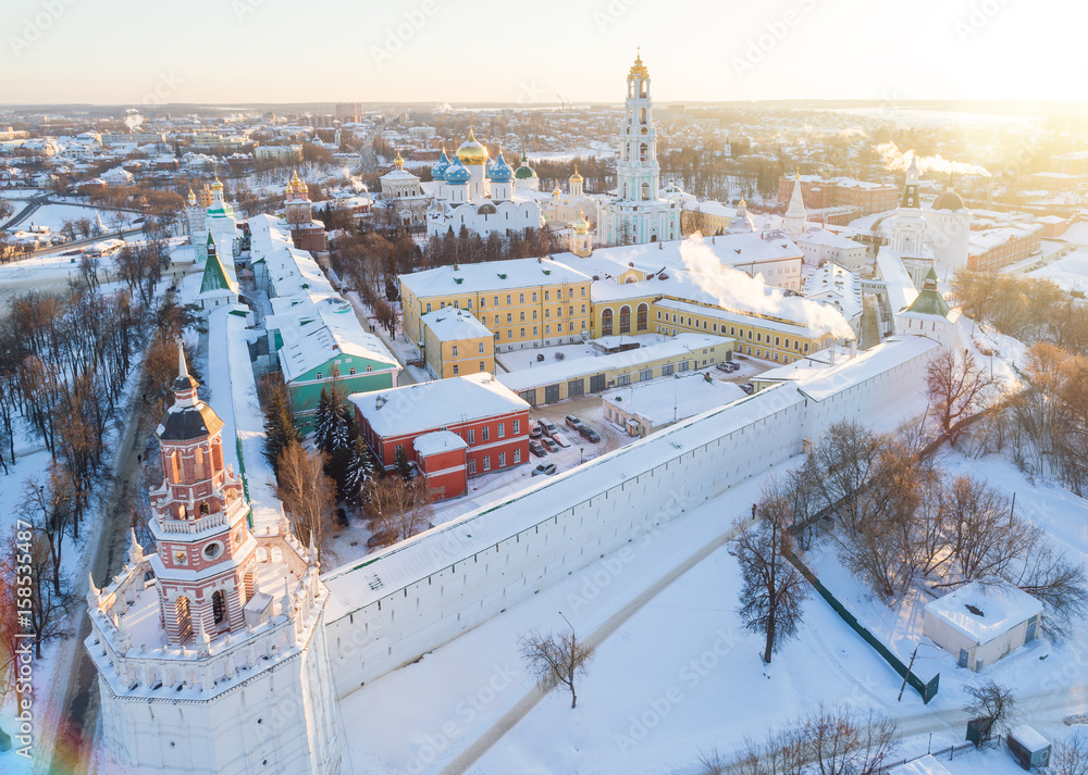 Aerial view on Trinity St. Sergy Monastery at winter sunny day. Sergiev Posad, Russia