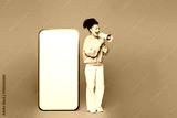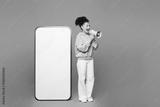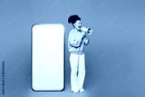 Young woman wear pink hoodie casual clothes big huge blank screen mobile cell phone smartphone with area scream shout in megaphone isolated on plain pastel light purple background. Lifestyle concept.