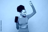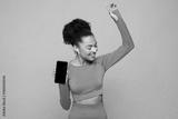 Young fitness trainer instructor woman wear earphones orange clothes spend time in gym use blank screen mobile cell phone listen music isolated on plain beige background Workout sport fit abs concept