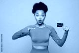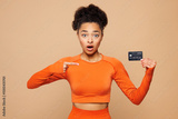 Young shocked strong fitness trainer instructor sporty woman wear orange clothes spend time home gym hold point on credit bank card isolated on plain beige background. Workout sport fit abs concept.