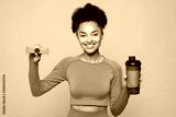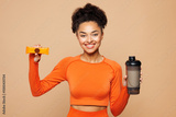 Young fitness trainer instructor woman sportswoman she wear orange clothes spend time in home gym hold eat protein bar protein shake isolated on plain beige background. Workout sport fit abs concept