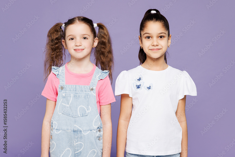 Little smiling Caucasian cool cheerful two friends kids children girls 9-10 years old wear casual clothes together look camera isolated on plain purple background studio portrait. Lifestyle concept.
