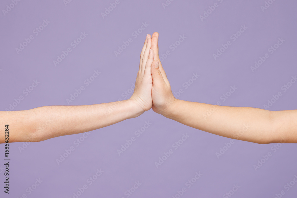 Close up cropped little two friends kids children girls female meeting together greeting giving high five clapping hands folded together isolated on plain purple background studio. Lifestyle concept.