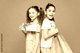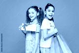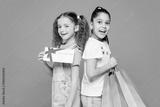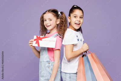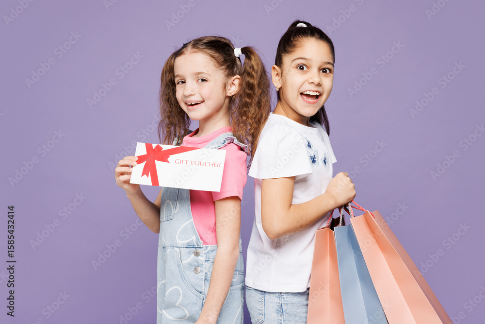 Little two friends kids children girls 9-10 year old wear casual clothes together hold shopping paper package bags voucher card isolated on plain purple background. Black Friday sale buy day concept.