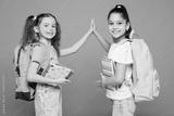 Little two friends kids children school girls 9-10 year old wear casual clothes backpack together hold books give high five isolated on plain purple background. Childhood education lifestyle concept.