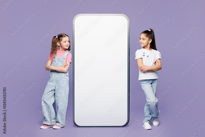 Full body fun little two friends kids children girls 9-10 years old wearing casual clothes together look at big huge blank screen area mobile cell phone smartphone isolated on plain purple background.