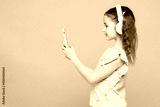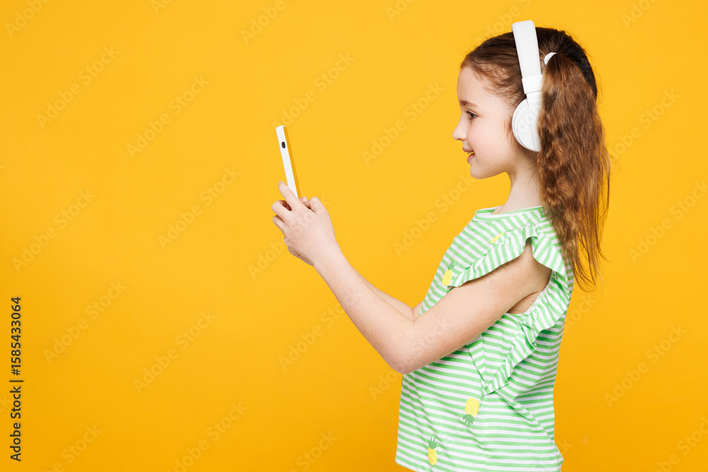 Side view little kid child girl 8-9 years old wears green t-shirt listen to music in headphones use mobile cell phone isolated on plain yellow background. Mother's Day love family lifestyle concept.