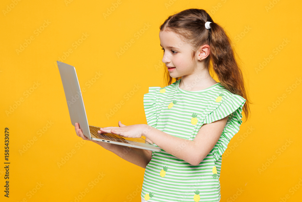 Little smiling smart IT kid child girl 8-9 years old wear green t-shirt hold use work on laptop pc computer chat online isolated on plain yellow background. Mother's Day love family lifestyle concept
