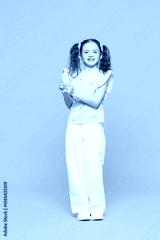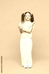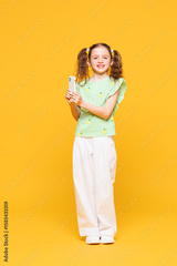 Full body little smiling kid child girl 8-9 years old wears green t-shirt hold in hand use mobile cell phone look camera isolated on plain yellow background. Mother's Day love family lifestyle concept