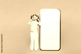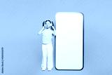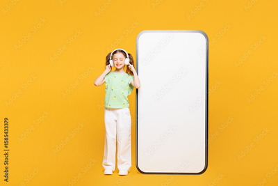 Full body little kid child girl 8-9 year old wear green t-shirt big huge blank screen mobile cell phone listen music in headphones isolated on plain yellow background Mother's Day love family concept