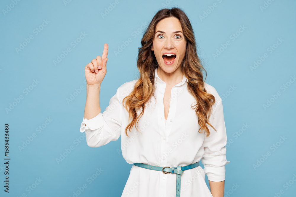Young employee business woman corporate lawyer wears shirt classic formal clothes work in office holding index finger up with great new idea isolated on pastel light blue background studio portrait.