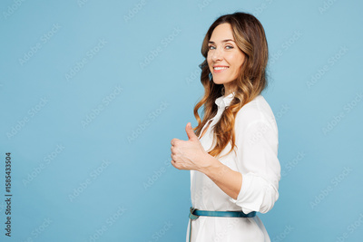 Young successful employee business woman corporate lawyer wearing shirt classic formal clothes work in office show thumb up like gesture isolated on pastel light blue color background studio portrait