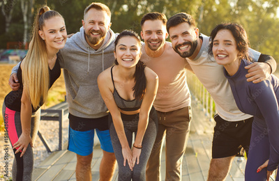 Happy hugs of confident young friends team before sports exercises in summer park. Support in fitness training and run workout of runners, people laughing. Friendship, healthy community concept