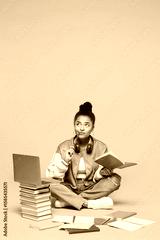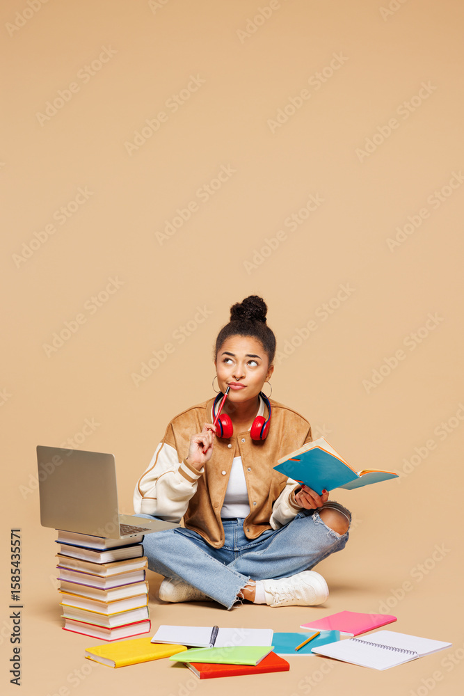 Full length young smart pensive girl student wear casual clothes backpack bag sit near books read notebook use laptop pc computer online isolated on plain beige background High school college concept