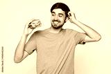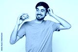 Young tempted sad minded confused man wears blue t-shirt casual clothes hold eat burger scratch head isolated on plain solid white background. Proper nutrition healthy food unhealthy choice concept.