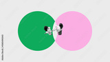 Collage of two women collaborating at center of overlapping green and pink business circles. Concept of mergers and acquisitions cultural alignment, employee retention, and goal synchronization.