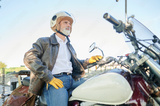 Senior biker wearing leather jacket and helmet sitting on motorcycle looking away