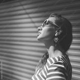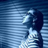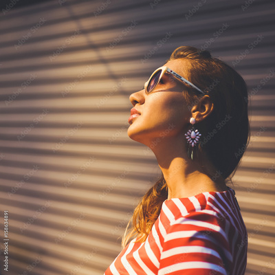 close-up portrait of a beautiful charming girl hipster in sunglasses blonde with full lips in a striped dress laughing and posing