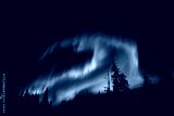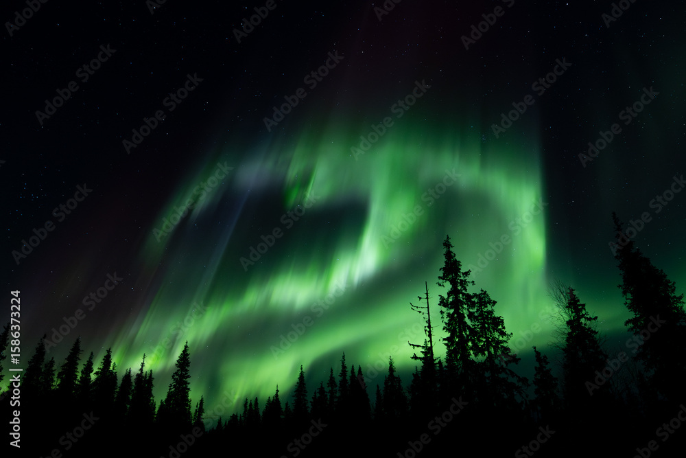 Stunning greenish Northern lights over snow-covered trees and white landscape during a full moon in Riisitunturi National Park, Lapland