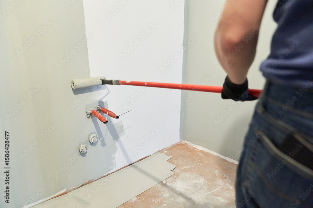 A man paints walls with a roller, working painting on the surface, painting walls in an apartment, repairing with white paint. With space to copy. High quality photo