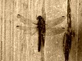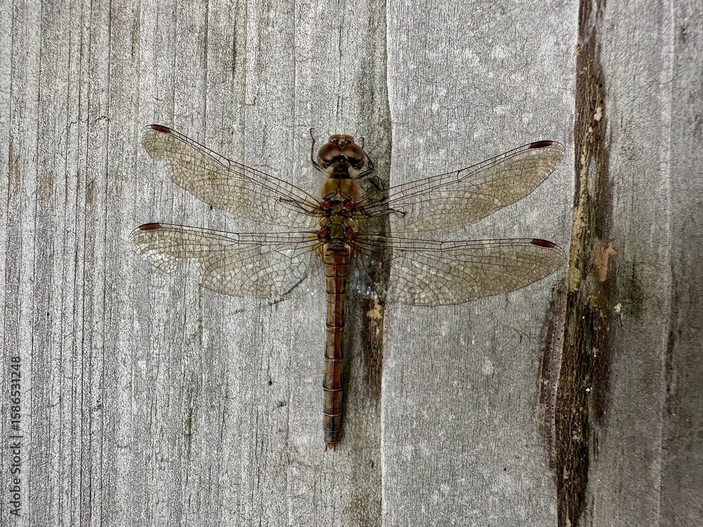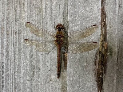Close-up of a dragonfly resting on weathered wooden surface outdoors, detailed wings and delicate insect body texture, showcasing natural beauty, tranquility, wildlife, nature photography concept