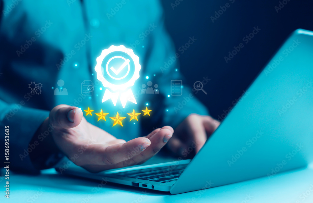 Hand shows sign of top service Quality assurance, Guarantee, Standards, ISO certification and standardization concept, satisfaction, service experience, show the standards of products and services.