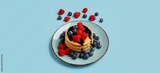 Plate of sweet pancakes with berries on light blue background