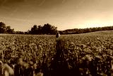Girl in a hat in the center of a poppy field leaves into the distance