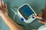 Man check blood pressure monitor and heart rate monitor with digital pressure gauge. Health care and Medical concept