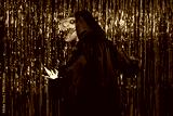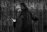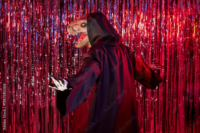 Portrait of person wearing dinosaur mask and black carnival costume with hood having fun on festive red foil background celebrating Halloween party. Horror and celebration concept.