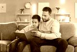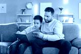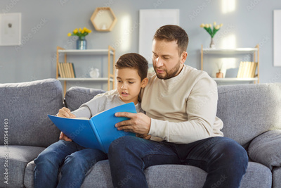 Caring father and attentive son spending leisure time together, reading a book on the couch at home. Education, learning, and the importance of shared activities or family bonding.