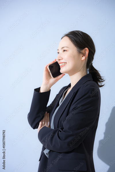 電話をかける通話するスーツを着た若い女性のビジネスシーンの横顔