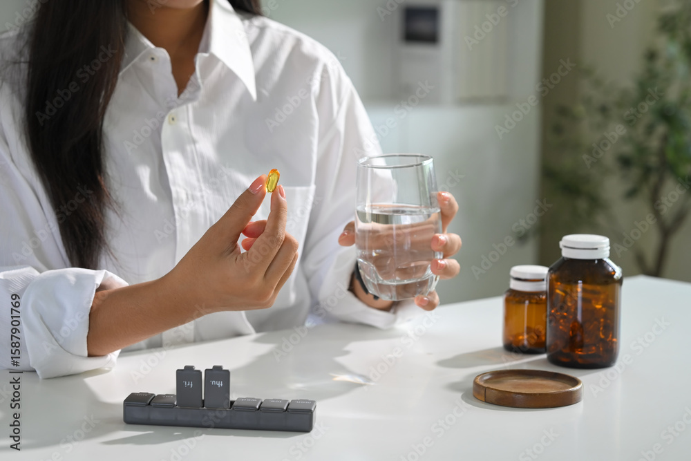 Close up of hands with fish oil and water glass, promoting daily health and wellness routine