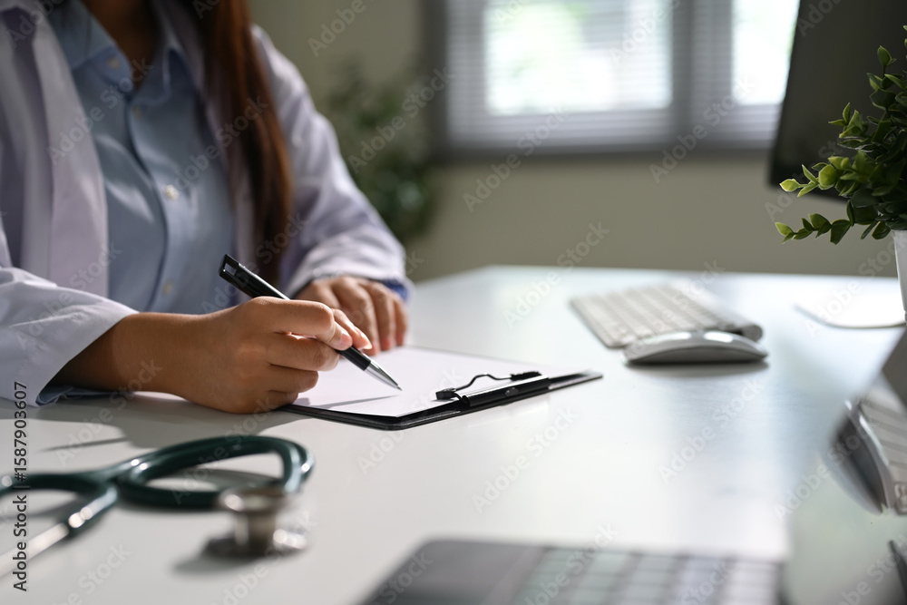 Female doctor writing on a clipboard at her desk during a consultation in a clinical office