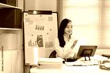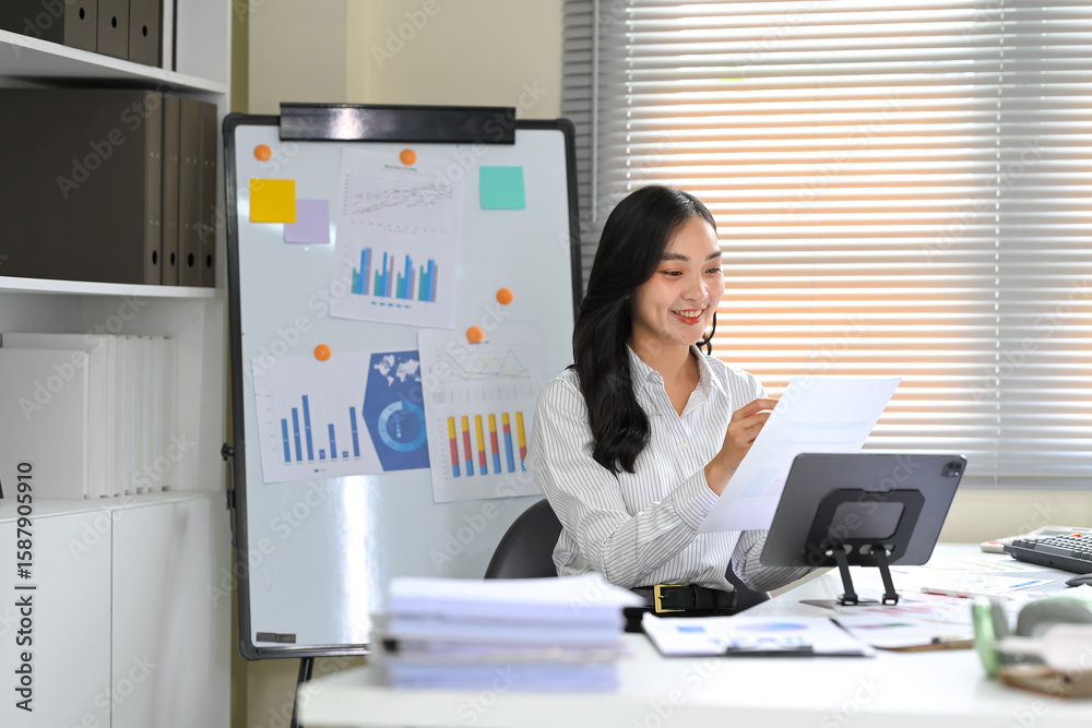 Confident Asian businesswoman working at her desk with digital tablet and documents