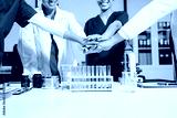 Healthcare professionals stack hands in a lab, symbolizing teamwork, trust, and success in medical research